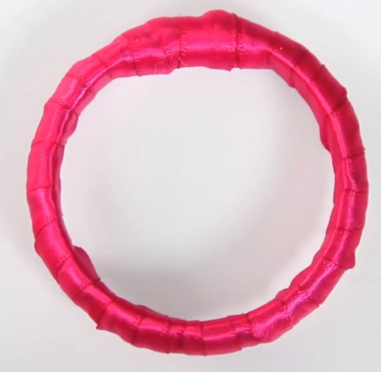 Используя горячий клей для фиксации края ленты, обмотайте вешалку и кольца лентами любого понравившегося цвета. Кончик ленты также закрепите с помощью горячего клея.
