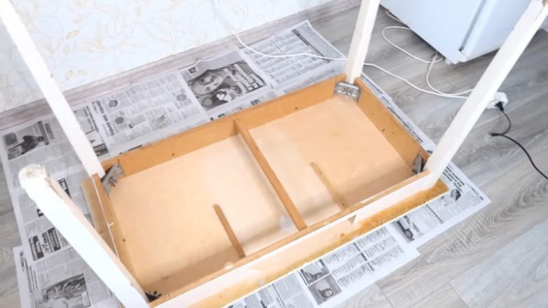 После этих процедур можно наносить краску в несколько слоёв. Даже простая белая краска будет смотреться очень свежо, особенно если сравнивать с тем, в каком состоянии мебель была до этого.
