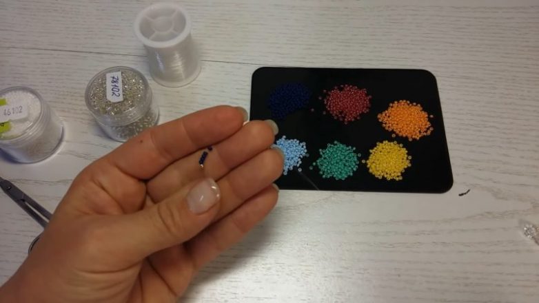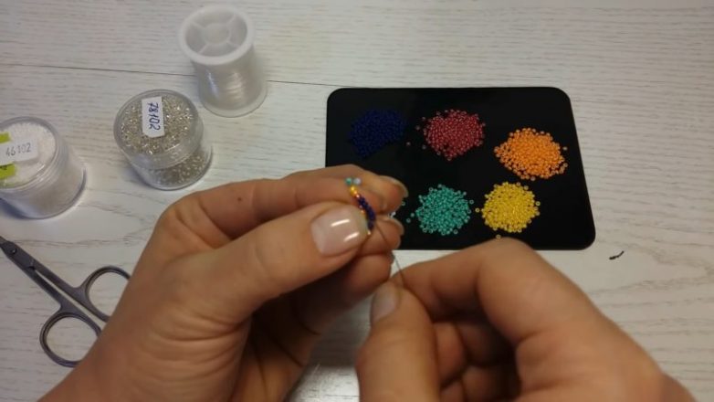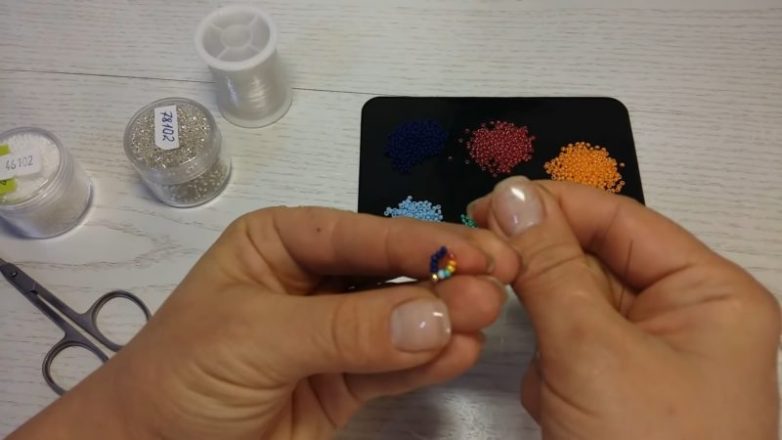 Далее наберите по одному цвету каждого бисера (в сумме это также 5 бисерин). Это также может быть только один цвет, по вашему желанию.