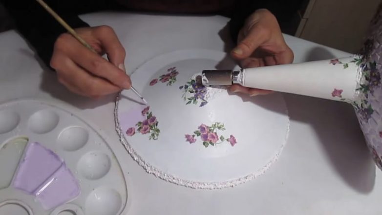 Покрыть поверхность ещё раз белой акриловой краской. Приклеить декупажные салфетки на клей, разведённый с водой.