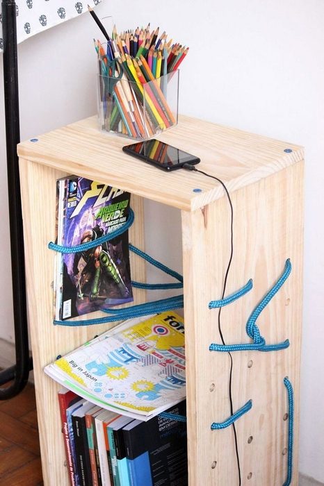 Отличный столик с веревочными полками украсит интерьер комнаты и сделает комнату уютнее.