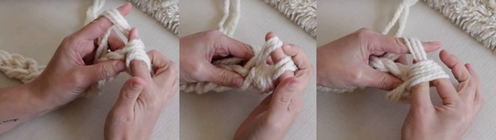 Чтобы добавить пряжу, когда мотки закончатся, обрежьте нити, чтобы они были одной длины. Привяжите три нити от новых мотков, сделав двойной узел. Удалите излишки нитей.