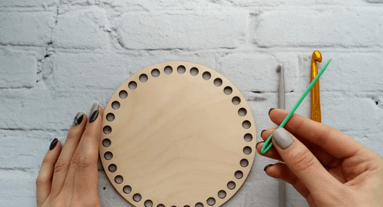 Определив внешнюю сторону донышка, вводим крючок в отверстие снизу и протягиваем через него нить, оставляя хвостик, длины которого будет достаточно, чтобы было удобно прятать нить.