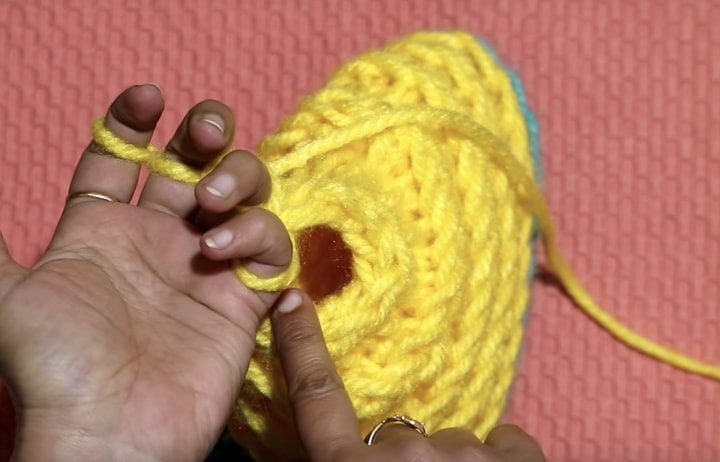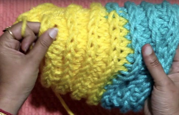 Вытяните нижнюю за верхнюю. Сделайте дополнительный ряд и повторите. Продолжайте до тех пор, пока не получите полотно достаточного для обхвата головы.