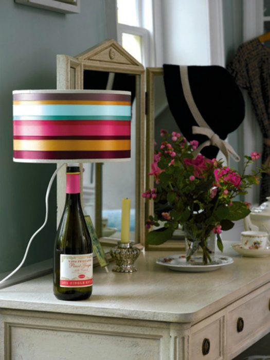 Для создания такого светильника нужно срезать дно винной бутылки и вставить туда лампочку. Дизайн светильника может быть самым разнообразным.