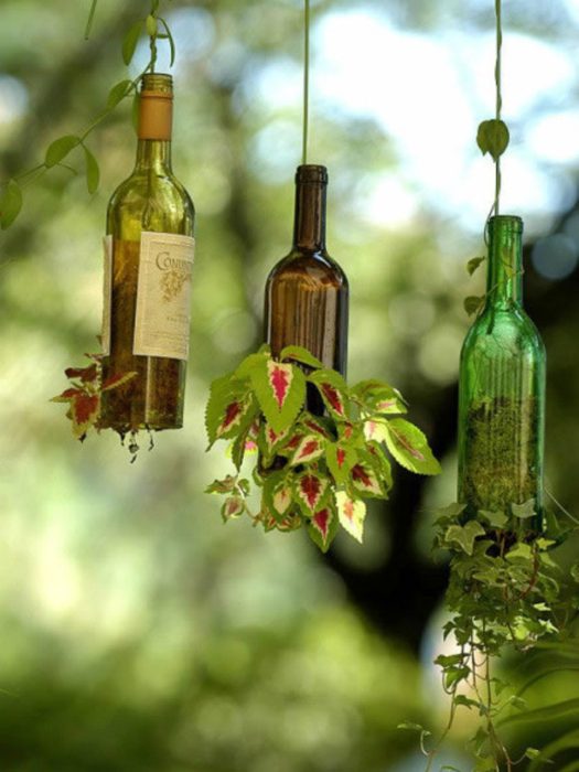 Горшочки для цветов из винных бутылок с источниками постоянной влаги.