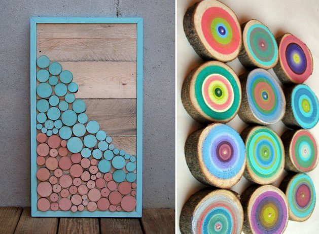 Важное примечание: если вы вдохновились идеей создания оригинального декора из деревянных спилов, начните свои эксперименты с использования покупных декоративных материалов. Декоративные спилы подвергаются специальной обработке перед сушкой, что делает их устойчивыми к усадке и пригодными для распиливания и окраски. А вот добытые лично вами фрагменты деревьев не так-то просто правильно высушить в домашних условиях — они могут потрескаться.