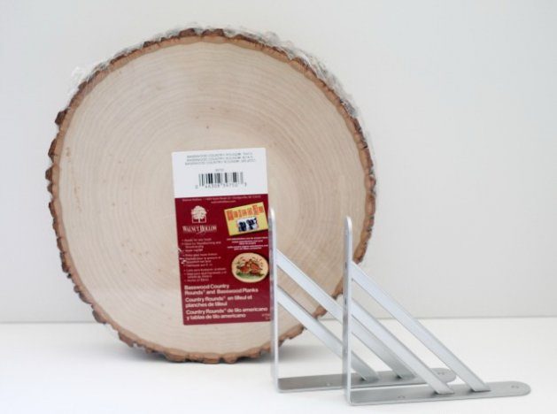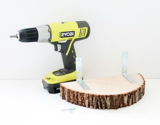 Вам понадобятся: один плоский круглый декоративный спил дерева, желательно большого размера (около 30 сантиметров в диаметре и около 5 сантиметров толщиной), крепежи для настенных полок соответствующих размеров, пила и дрель.