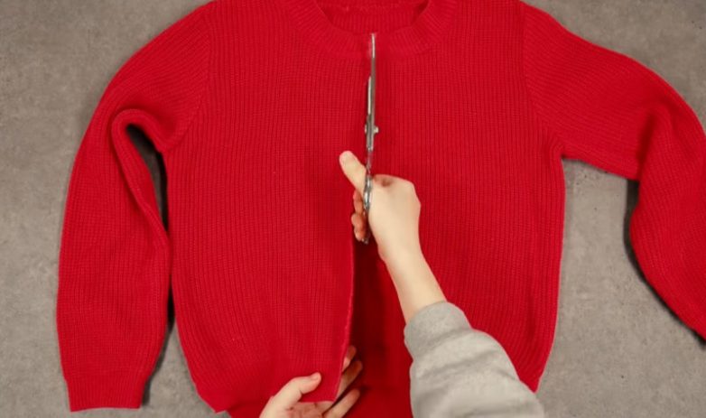 Первое, что необходимо сделать — разрезать свитер посередине спереди.