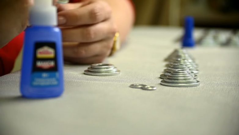 Для декора склеиваем супер-клеем между собой пирамидки из обычных шайб разного размера. Можно нарезать шайбы из картона, покрыть металлической краской и также склеить между собой.