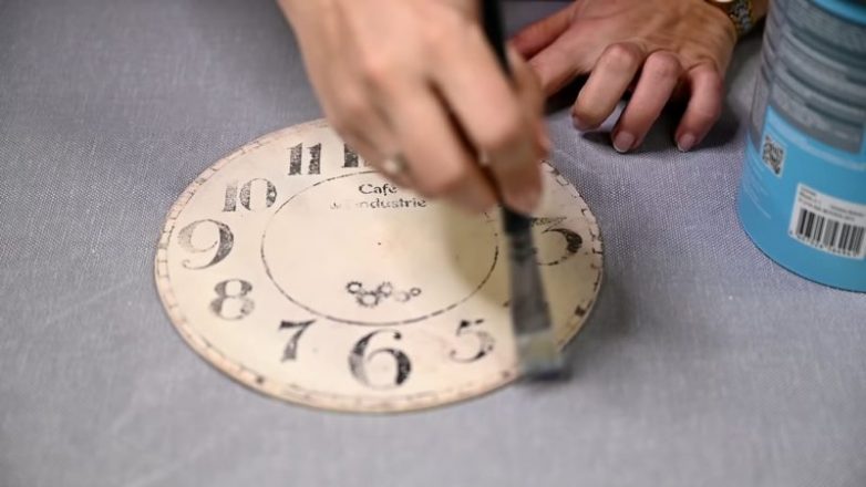 Распечатанный зеркально на лазерном принтере циферблат часов располагаем ровно на круге, промакиваем бумагу жидкостью для снятия лака или ацетоном, сильно прижимаем и разглаживаем, например, шпателем, чтобы перенести рисунок. Он переносится именно так, как нужно, создавая потертый винтажный эффект. Снимаем бумагу, поверхность лакируем. Тем же матовым лаком покрываем и все остальные детали.