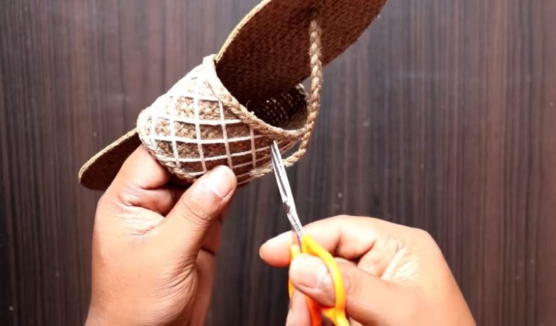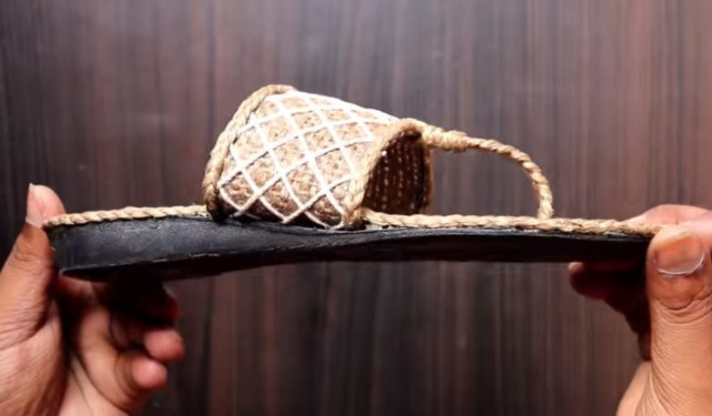 В подошве сделайте небольшое отверстие и проденьте через него верёвку, заплетенную в косичку. Закрепите верёвку с нижней стороны подошвы горячим клеем.