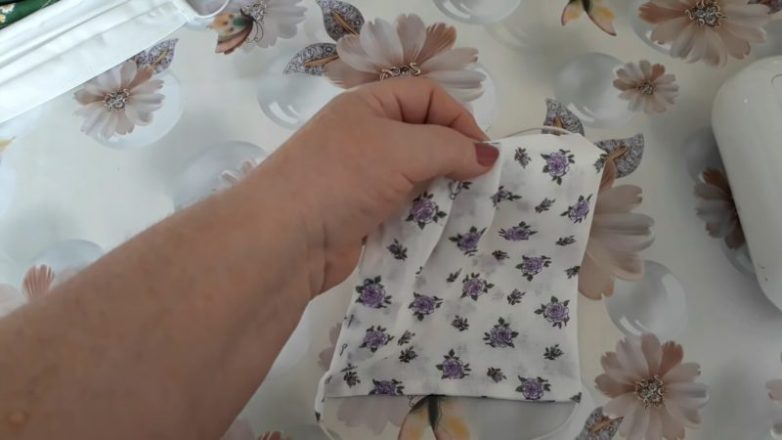 Ткань желательно выбирать плотную, хлопчатобумажную, либо заворачивать тонкую в два-три слоя. Размер ткани — 36*20 см. Также вам понадобится резинка. Складываем ткань пополам. Когда будете прошивать маску по кругу, по углам вшейте резинки.