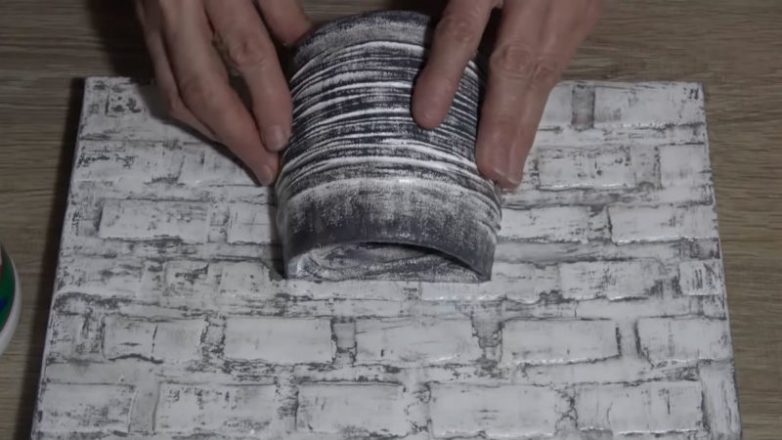 На высохшую и ровную поверхность нанести клей ПВА. Когда слой подсохнет, следом нанести акриловую белую краску. Когда она высохнет, покрыть поверхность акриловым лаком. Когда лак затвердеет, нанести серую краску и через 5 минут вытереть её влажной тряпкой, создавая эффект состаренной поверхности. Когда краска подсохнет, вновь нанести акриловый лак.