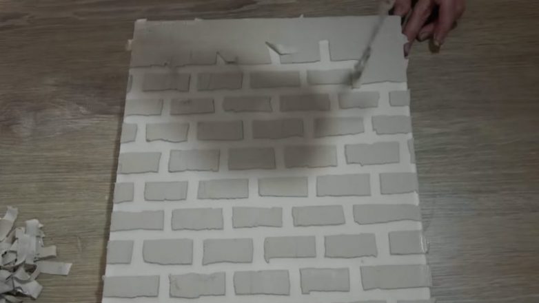 На холст следует нанести шпаклевку, выровнять с помощью линейки. Когда она подсохнет, приклеить сверху скотч в шахматном порядке, чтобы получилась имитация кирпичной стены. Нанести сверху шпаклёвку ещё раз, выровнять, убрать скотч, дать высохнуть. Зачистить поверхность наждачной бумагой.