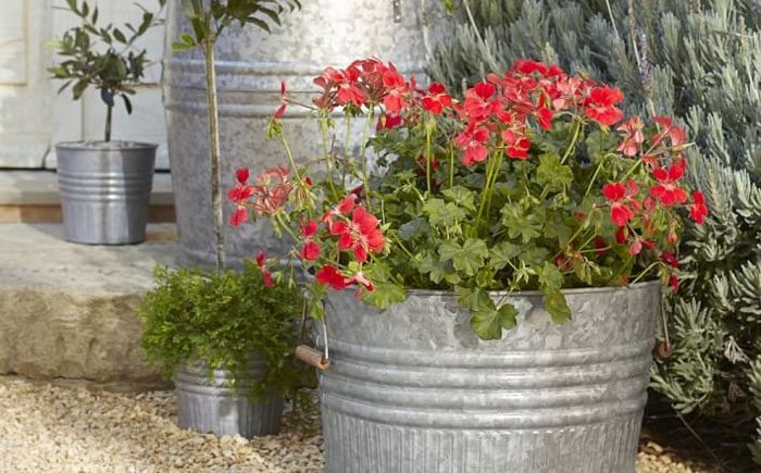Контейнеры из оцинкованного металла бывают разных форм, размеров – от маленьких ковшей и банок до больших баков. Их можно гармонично сочетать, выглядеть они будут эффектно. К тому же будет возможность в одинаковые контейнеры и растения высадить, и воду для их полива набирать.