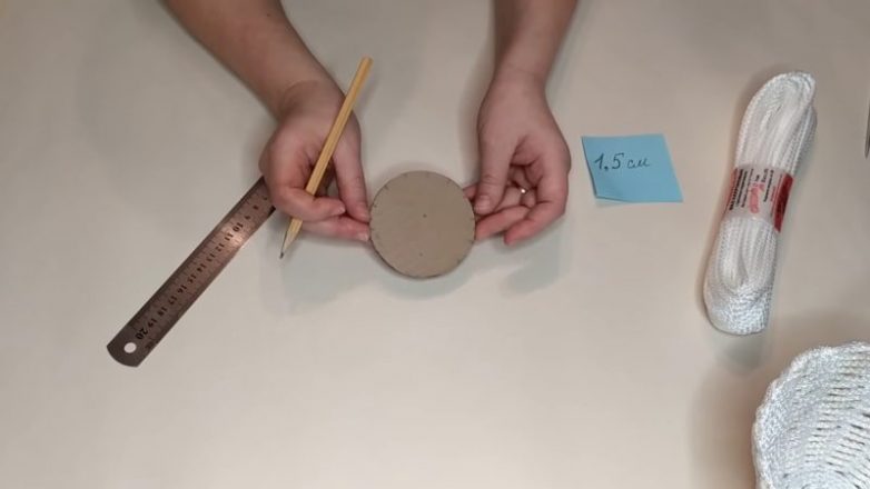Для основы корзинки нужно взять два кружка из картона диаметром 7,5 см и склеить их между собой. Линейкой отмерить по краю 1,5 см, карандашом сделать насечки, а затем — небольшие углубления спицей или любым другим тонким острым предметом.