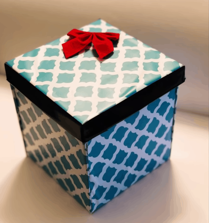 Дальше остается вложить в коробку подарок, поднять все стенки и накрыть их крышкой.