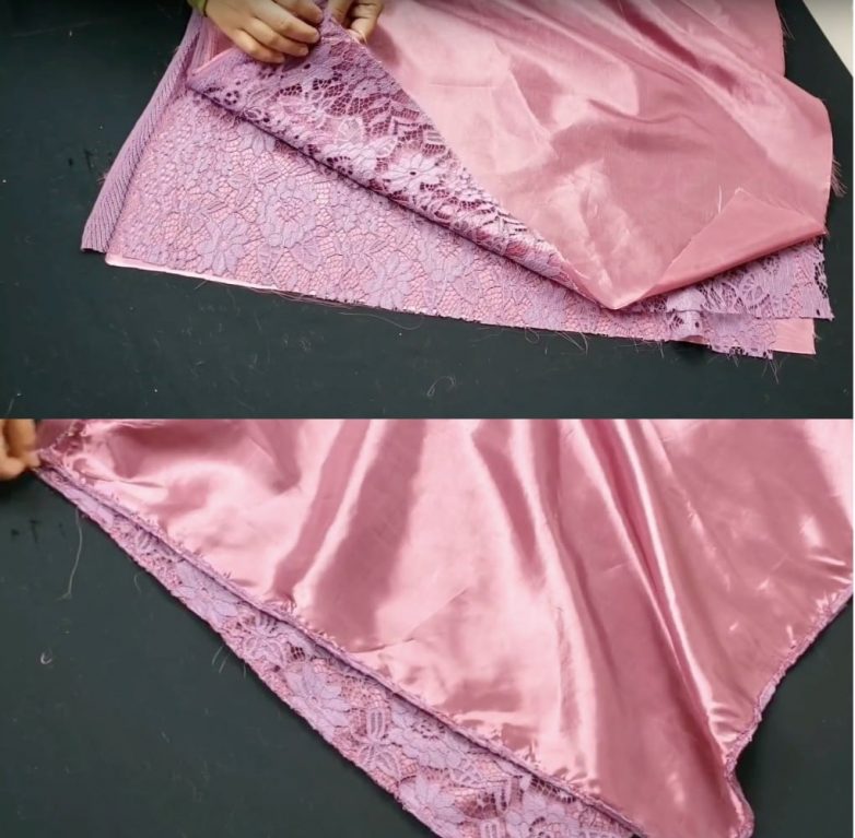 Теперь начинаем сшивать обе части с подкладом друг с другом. Выворачиваем платье подкладом наверх, то есть наизнанку, и прошиваем сначала в области плеча, затем — боков. Оставшийся край подола просто подворачиваем и прошиваем.