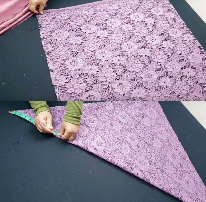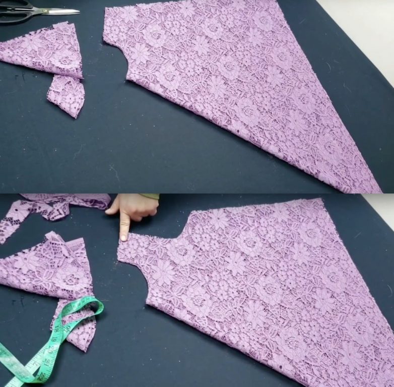 Разворачиваем нашу выкройку. Теперь разрезаем выкройку на 2 части и, используя ее как трафарет, вырезаем подклад для платья. Сшиваем подклад и кружево, но пока только в области выреза.