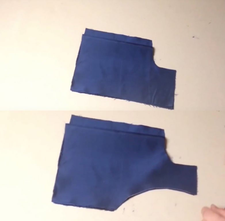 Теперь нужно наметить вырез и рукава. Для этого вырезаем с одного края скругленный равнобедренный треугольник со сторонами по 10 см — это будут рукава. С другого края намечаем треугольник со стороной 8 см и диагональю 16 см. У нас получилась грудь и спинка, разделенная на 2 части спинка. Это разделение нужно для того, чтобы потом вшить в него молнию.