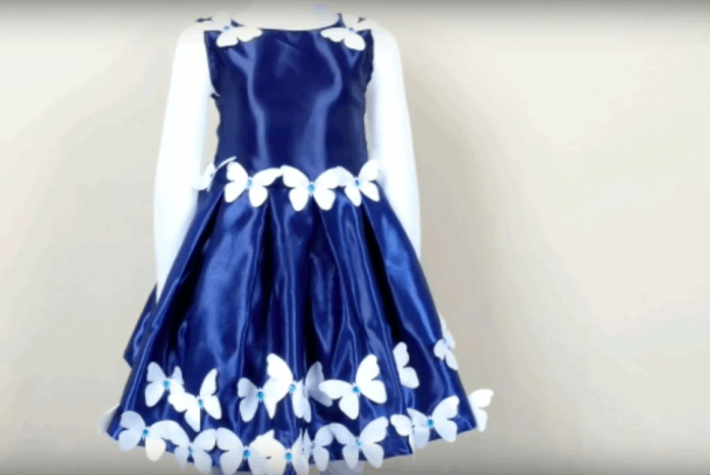 Из ткани подкладка вырезаем бабочек и украшаем ими платье. Бабочек можно пришить, а можно просто закрепить на горячий клей.