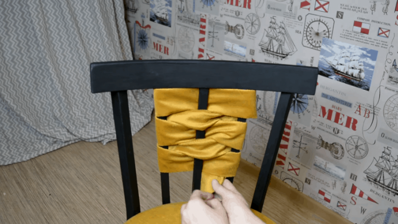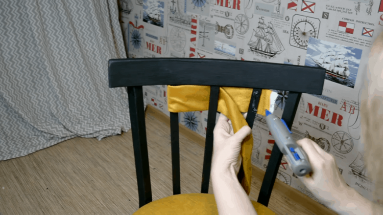 Украшаем спинку при помощи все той же обивочной ткани. Из остатков делаем широкую ленту, которой должно хватить для того, чтобы обвить спинку. Закрепляем начало ленты на боковой прут при помощи клея и даем высохнуть.