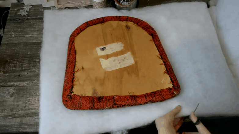 В качестве наполнителя используем синтепон. Чтобы не делать выкройку, просто прикладываем сидушку к куску синтепона и вырезаем с учетом припусков 5-7 см.