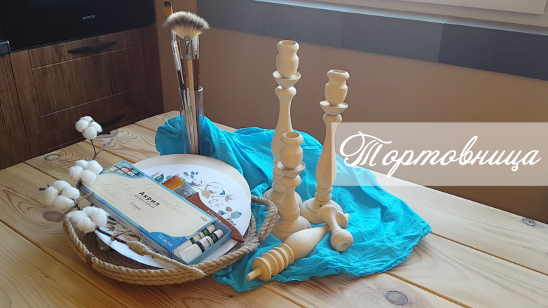 У меня есть разборные деревянные подсвечники, один из них и послужит устойчивым и изящным основанием ножки, а декупажная заготовка для часов тарелкой.