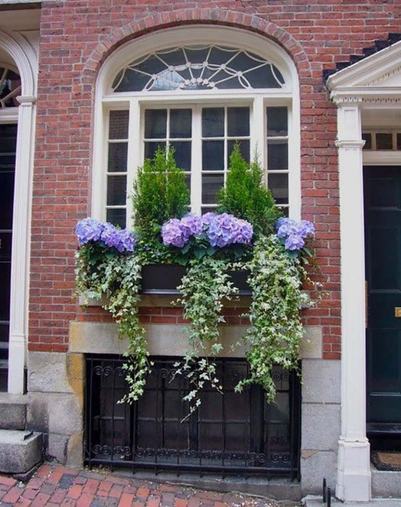 Вот интересное решение, в котором обычный контейнер заменяют два горшка по бокам от окна, прикрепленные к стене коваными зажимами.