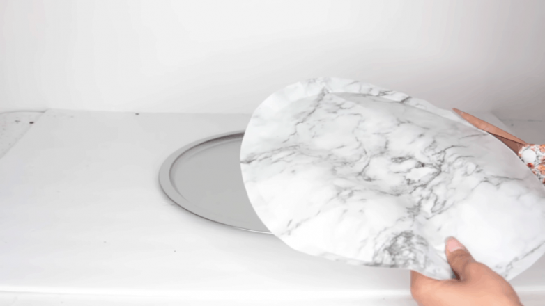 В качестве столешницы используем любое подходящее блюдо. Для начала прикладываем к перевернутому листу самоклейки и обводим его. Воспользовавшись стеком или шпателем проходим по кругу под бортиком, стараясь продавить бумагу, чтобы обозначить внутренний круг.