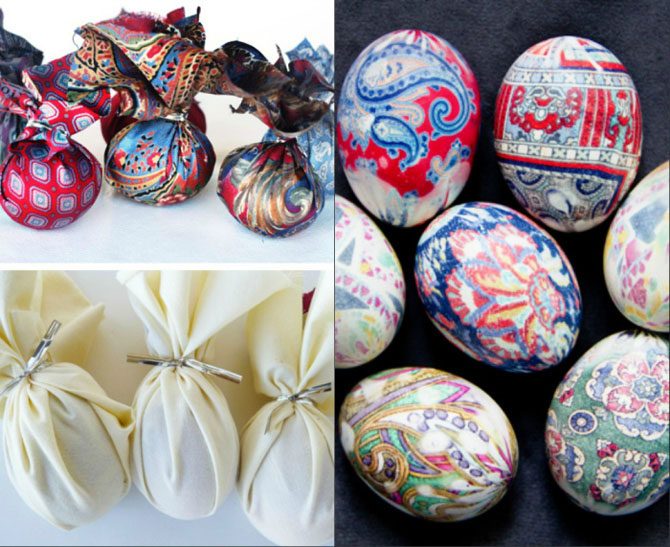 Поскольку, шёлк прекрасно передаёт свой цвет, невозможно этим не воспользоваться для создания интересного окрашивания. В качестве основного материала можно использовать старые галстуки, шейные платки или просто отдельные отрезки ткани. В кипящую воду с уксусом погружают яйца, обёрнутые шёлком, а сверху куском белой ткани. Таким образом, на скорлупе отпечатается рисунок, который можно дополнить, например, приклеив бисер, бусинки, кружево, бумажных бабочек. Ткань лучше выбирать поярче, поскольку готовый рисунок получится несколько тусклым.