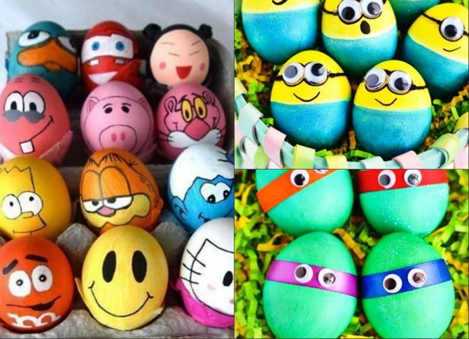 Из огромного количества нарисованных персонажей можно выбрать любимые и создать красочные пасхальные яйца. Для их росписи используются акриловые краски или гуашь. Можно создать 3D эффект, дополнив бумажными элементами. Несомненно к изготовлению стоит привлечь детей, позволив им проявить фантазию и возможность создать своего персонажа.