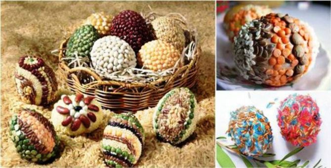 Издавна злаковые культуры использовались как украшение пасхальных яиц, олицетворяя символы плодородия и достатка. Сочетание различных семян всегда создает интересную композицию. А дополнительным элементом декора могут послужить макароны различных форм, покрашенные золотой или серебряной красками.