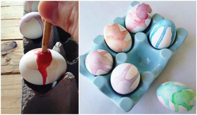 Данную технику можно назвать «ленивой», или не требующей выдающихся талантов в сфере изобразительного искусства. Достаточно лишь окунуть кисть, прижать к скорлупе и дать возможность акварельной краске хаотично стечь. Высыхают такие узоры очень быстро. Можно использовать и несколько цветов, которые будут постепенно переходить друг в друга.