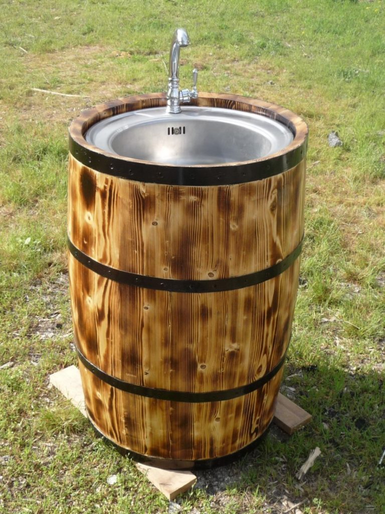 Отличный вариант — умывальник в бочке, в которой можно незаметно разместить резервуары для чистой и использованной воды.