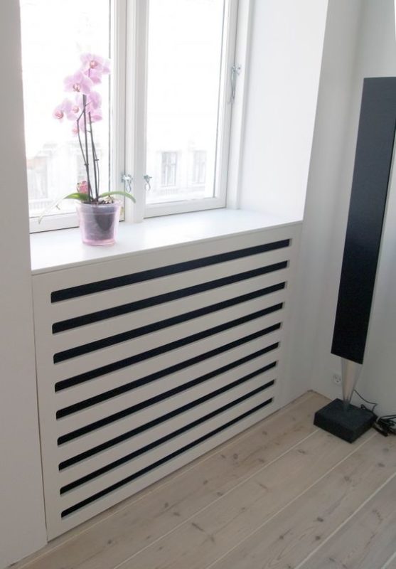 Пространство над батареей можно сделать функциональным, закрыв батарею экраном с полочкой сверху.