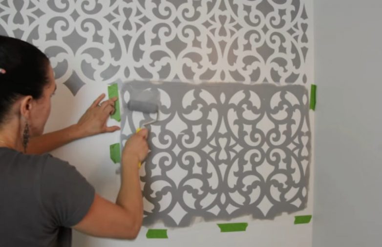 Чтобы покрасить стены с помощью трафарета понадобится клейкая лента. С ее помощью закрепите трафарет в одном из углов и начните процесс окрашивания серой краской. Наносите краску тонким слоем, что позволит избежать подтеков под трафаретом. Наносите второй слой краски только после полного высыхания первого.