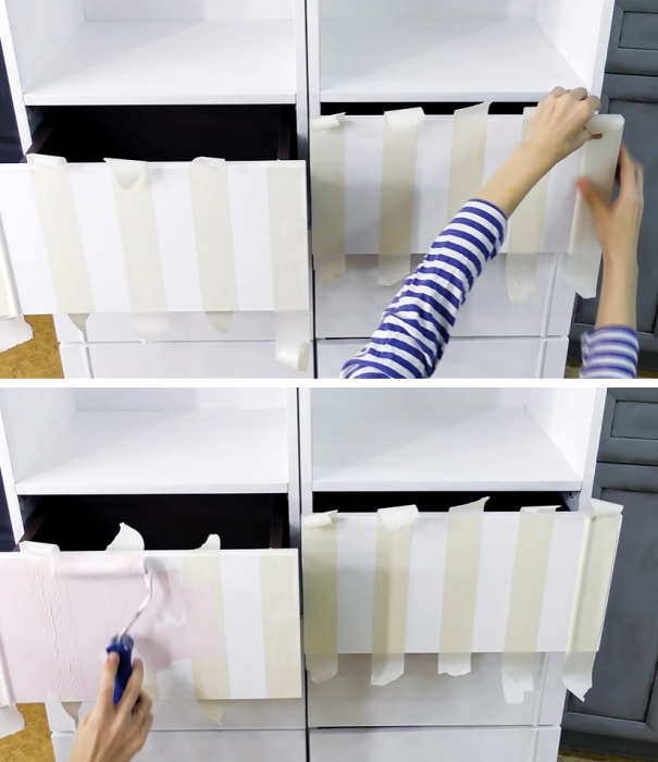 Меловая краска является прекрасной основой для создания особого дизайна, но для получения идеально гладкой поверхности стоит провести подготовительную работу. После высыхания последнего слоя всю закрашиваемую часть лучше слегка зашкурить, чтобы уменьшить шероховатость. После этого фасады мебели можно красить в любой понравившийся цвет. В рассматриваемом примере девушка решила сделать два ящика полосатыми. Для этого в белую краску она добавила несколько капель красно-фиолетового тона и коричневого колера, чтобы получить бледно-розовый цвет. Потом приклеила на поверхность полоски малярного скотча, который после окрашивания, не дожидаясь высыхания, аккуратно сняла.