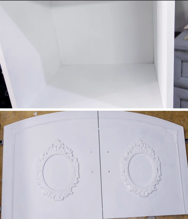 Совет: Автор ролика в целях экономии краски внутреннюю часть закрытых ящиков и полок не стала тщательно закрашивать, но этого делать не следует. За такого рода недоработки постоянно будет цепляться взгляд и, в конечном итоге, «проплешины» начнут раздражать.