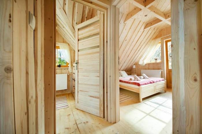 На второй этаж ведет деревянная лестница. Здесь пространство поделено на 2 спальни. Одна из которых по площади превышает другую комнату. В ней стоит двуспальная кровать, диван и комоды. Имеется выход на просторный балкон. Вторая спальня очень миниатюрная, но довольно уютная.
