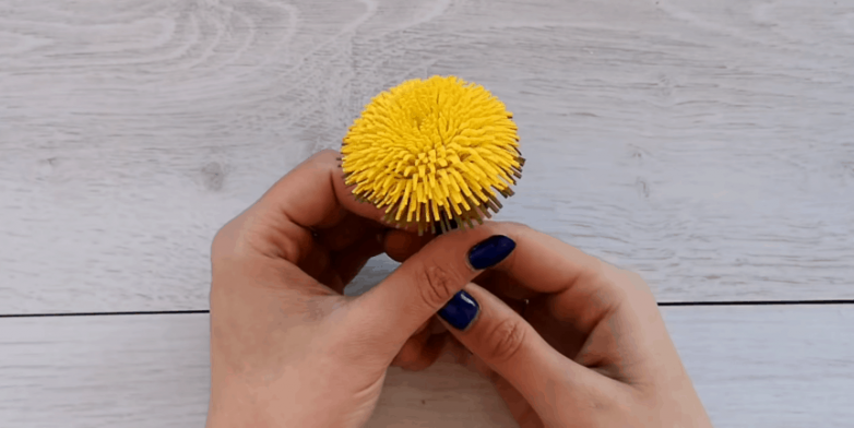 Захватив край желтой заготовки пинцетом, постепенно промазываем клеем не разрезанный фрагмент и одновременно скручиваем основу будущего одуванчика. По окончании одной полосы, не делая промежутка, переходим к накрутке следующей.