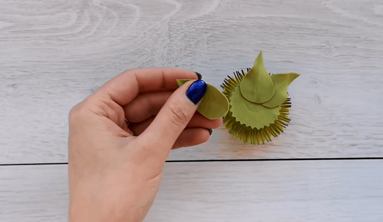 Перевернув заготовку, делаем замеры. Заклеиваем донышко, а затем вырезаем несколько листиков и также приклеиваем их к основанию. Поскольку основание листьев не будет находиться на виду, копировать природную форму не обязательно. Важно, чтобы кончики были заострены, и листочки имели изгиб посредине.