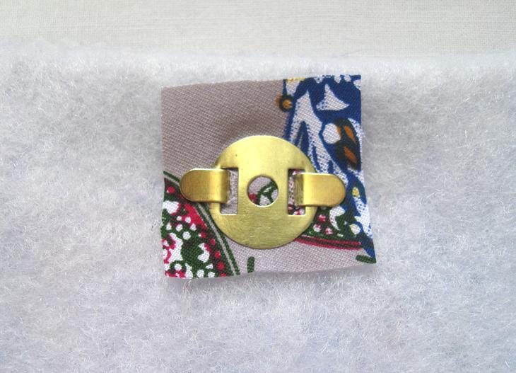 Отступив от края посредине детали примерно 3 см, надрезаем распарывателем входы для крепления магнита, продеваем, далее надаваем на крепления кусочек продублированной ткани (у меня основная), далее металлический кружок.