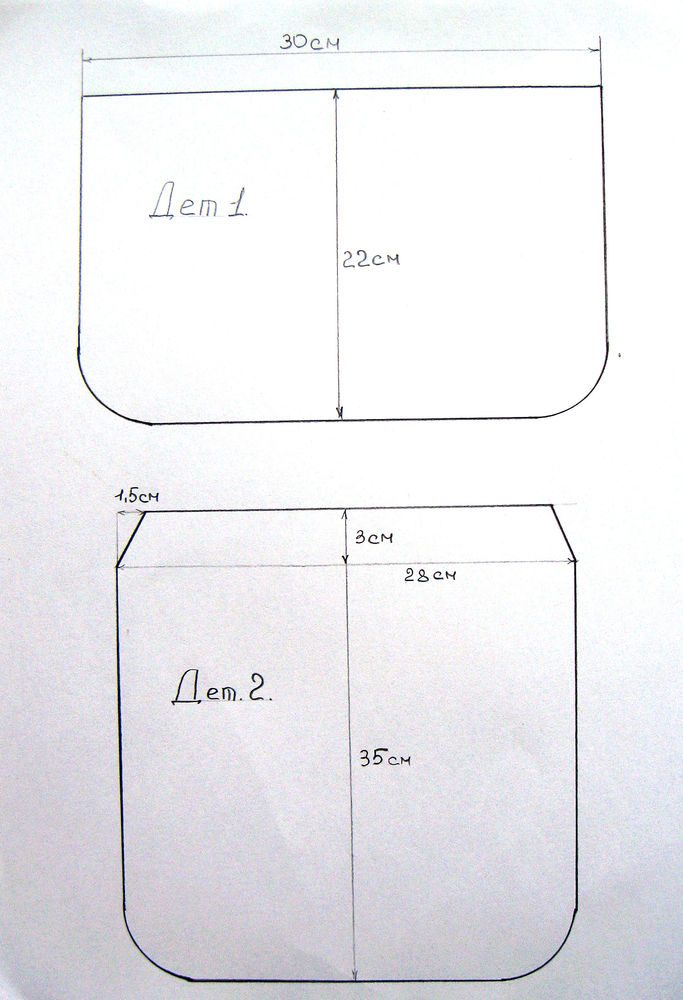 Ткань дублируем, выкраиваем дет. 2, 28*35. Нижний край скругляем, по верхнему краю делаем скосы высотой 3 см и шириной 1,5 см (см. фото в начале мастер-класса).