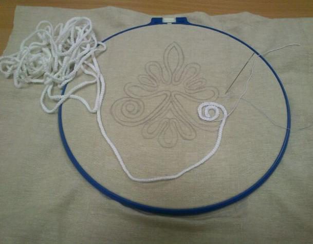 6. Прикладываем шнур по “периметру” узора и пришиваем нитками