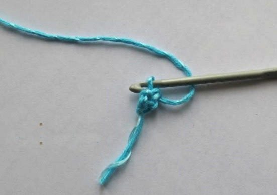3. Под две нити, которые выходят из первой воздушной петли вводим крючок, захватываем рабочую нить и вытягиваем две петельки, на крючке образовалось две петли: рабочая и вытянутая. Захватываем рабочую нить и вяжем столбик без накида