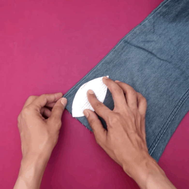 На куске ткани, которая станет основой для коврика, обозначаем окружность, а затем выкладываем лепестки по кругу и фиксируем их при помощи клеевого пистолета. Лепестки должны слегка заходить один на другой. Последний лепесток заводим под первый, чтобы не нарушать рисунок. Для удобства обрезаем лишнюю ткань.