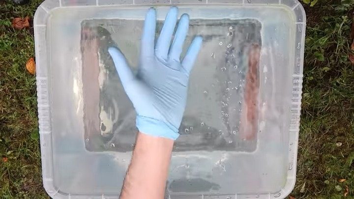 Теперь понадобится большой пластиковый контейнер, который нужно наполнить водой. Не забудьте защитить руки перчатками!