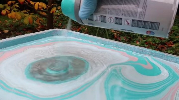 Вооружившись баллончиками с красками разных цветов начинаем формировать на поверхности воды плёнку. В зависимости от задумки, распыляем краски друг за другом, направляя струю в центр.